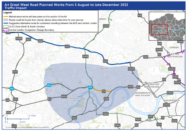 March 24, 2023 Significant traffic problems are expected in the Chiswick and Brentford areas this weekend due to a planned closure of the A4 and M4. The road will be shut from 10pm on Friday 24 March to 5am on Monday 27 March eastbound between Hogarth Roundabout and Junction 2 of the M4. There will also be a closure of one lane westbound between Hogarth Roundabout and Chiswick Roundabout. This is to enable further work on the Cromwell Rail Bridge near Harvard Hill that was originally due to take place last year but had to be postponed on a number of occasions because of cold weather and transport strikes. There will also be a resurfacing of the A4’s junction with Sutton Court Road. TfL says now that work on this section of the A4 will be completed by mid-2023 having been originally scheduled to be finished by the end of 2022. Night time work is also taking place from Tuesday 21 March and Wednesday 22 March from 10pm to 5am. This will require the closure of the A4 (westbound) between Chiswick Roundabout and Hogarth Roundabout with no access from all routes leading onto the A4 westbound between these points. There will also be no access to Sutton Court Road from the A4 westbound.