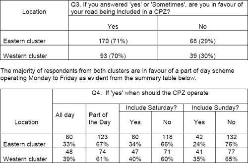 The Chiswick Area Planning Committee will be discussing the findings of the preliminary consultation carried out in Grove Park and Strand on the Green on the possible introduction of a CPZ at their meeting on Tuesday 15th September. The consultation results show that there are two clusters, western and eastern shown here, of support for parking controls where two separate possible Controlled Parking Zones (CPZs) could be considered for further consultation. There is also support from Redcliffe Gardens but it would be fairly remote from the other roads where there is support. The parking problems here appear to be mainly due to a lack of off-street parking that would not be resolved by parking controls. Therefore it is recommended that it is not included in further consultation at this stage. The table below shows the summary of the responses to question 3 from the roads within the two clusters in favour of parking controls.