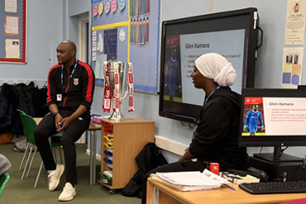 Brentford FC's Marcus Gayle and Salma Mahamud talk to the children
