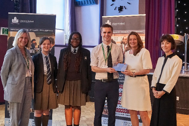 Zac Moxon (third from right) shows his award to Gillian Keegan (second from right)