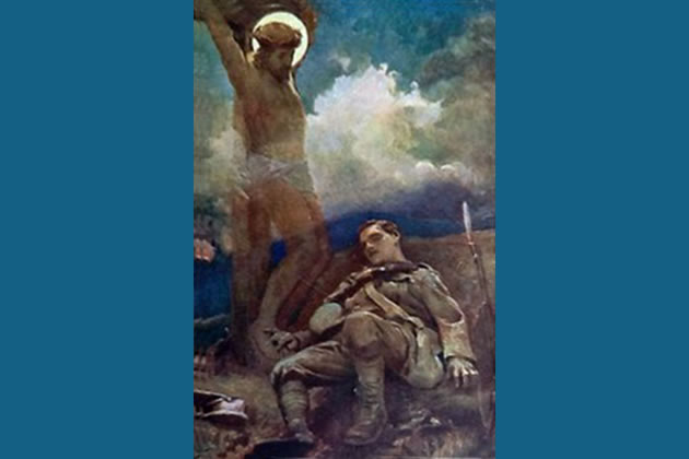 The forgotten story of two Chiswick artists who created iconic World War One images is being highlighted this weekend by St Michael & All Angels Church, as it puts its Remembrance commemorations online because of the new lockdown rules. The church is encouraging people to join its 10am Remembrance Sunday service and keep the two-minute silence in their own homes. The artist James Clark, who lived in Rusthall Avenue W4, rose to fame in 1915 when he painted The Great Sacrifice, which was described as “the most popular painting of the war”. His youngest son Captain Cosmo Clark MC saw action in France and documented the war in sketches and letters. Their stories are told this week in a new ‘Writers Tales’ entry on the Chiswick Timeline of Writers and Books. The Great Sacrifice depicted a dead soldier in British uniform at the foot of a ghostly figure of Christ on the Cross. It became a popular print and was used as a war memorial in many public buildings and in stained-glass windows. Queen Mary, the wife of King George V, bought the original painting. After the war, James Clark painted a large mural for St Michael & All Angels – The Salutation – which is displayed in the north aisle of the church. The full story is told at: James Clark, The Great Sacrifice and The Salutation. Cosmo Clark’s sketches and letters are published in a book called The Tin Trunk and form the basis of a play Cosmo’s War by former BBC producer Bernard Adams. The play was due to be performed this weekend in St Michael & All Angels Church but production was halted because of Covid-19. The full story is told at: The Tin Trunk: Letters and Drawings 1914-18.