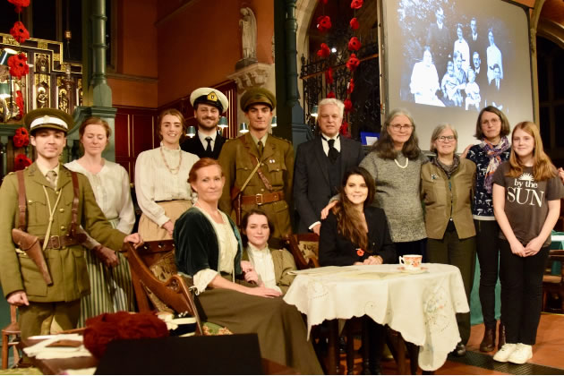 A reading of a play based on the letters of a man from Chiswick who served in the First World War has been praised by his descendants. Family members of the Bedford Park artists James and Cosmo Clark have described how delighted they were by the reading of Cosmo’s War at St Michael & All Angels Church on Remembrance Day. No fewer than six of James Clark’s great granddaughters attended the performance and Cosmo’s granddaughters and great-granddaughters were photographed with the cast afterwards. Cosmo’s granddaughter Fran Rhys said, “It was very moving to be there and it was a most professional and polished production – very many congratulations”. Her sister Annie said “What an amazing evening – thank you to all who made it possible.” Mark Izatt, a trustee of the veterans’ mental health charity Combat Stress, wrote on Twitter, “It was a superb performance. I had read the letters before but this gave them a whole new meaning”. Cosmo’s War was written by Bernard Adams, a former BBC producer, based on Cosmo Clark’s letters, to and from his family at 44 Rusthall Avenue W4. Copies of the play are now on sale via Amazon. Cosmo volunteered for active service at the age of 17 and won the Military Cross. He documented his experiences in drawings and letters from the front and later became a well-known artist. His father James Clark painted The Great Sacrifice, described as “the most popular painting of WW1”, and The Salutation mural in the north aisle of St Michael & All Angels Church.