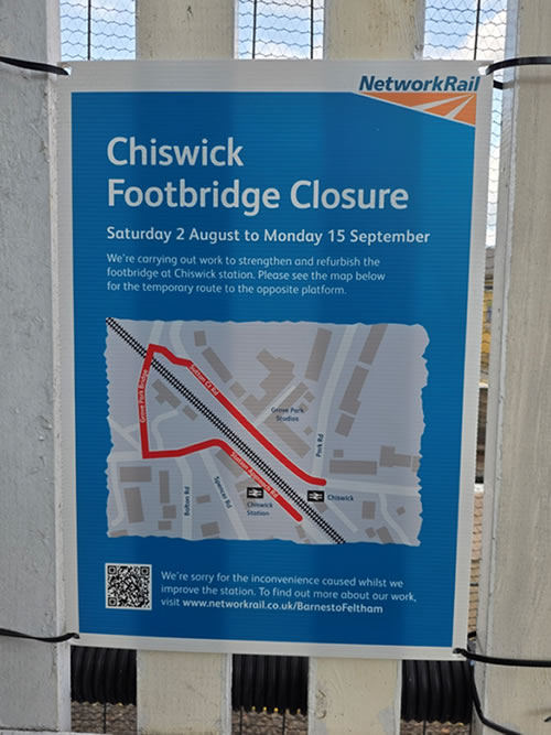 A Network Rail spokesperson said, “We’re very sorry to residents living near Chiswick station for the disruption experienced over the past few evenings. As part of our essential safety critical refurbishment works on Chiswick station footbridge, we are undertaking mechanical descaling, which involves removing old paint from the structure. “Noise levels are being monitored and we have begun installing acoustic barriers to help reduce the impact. This won’t eliminate the noise entirely, but it will mitigate it. “The mechanical descaling phase of work is expected to finish by the end of Friday evening at 10pm. This will be followed with preparing the structure for painting which will be less disruptive, and every effort will be made to complete this work during daytime. “To complete the works, there are further day and night-time works planned during the railway line closure from 23–31 August during which steel work repairs will take place. “We are committed to minimising disruption wherever possible and a further update will be provided to lineside neighbours prior to 23 August.” The footbridge will remain closed until 15 September.