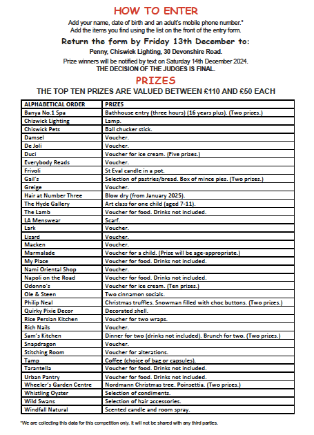 That’s about absenteeism. Many other Labour councillors are clearly indulging in a form of presenteeism: attending but not engaged, silent except for brief moments when they are obliged to rah rah rah the Labour leader or cabinet member, momentarily becoming animated with self-congratulatory clapping, or mocking us. It’s yet more politics of the playground, highlighting the value for money aspect of an inactive councillor claiming the councillors’ allowance. Chiswick Tower development and Gunnersbury station improvements Currently still the tallest building in Chiswick – it rises 19 storeys above Gunnersbury station – residents have understandably been nervous about its next incarnation. With changes to the way we work post-pandemic, traditional office space is less in demand. The main occupant, BSI, is to relocate to central London; around a third of the space remains vacant; its time has passed. A revamp is inevitable. Many are glad that the current proposition is to reconfigure it, not knock it down and start again, reducing the potential carbon impact of a rebuild. I’ve been consistently critical of planning applications that create ghettoes, dividing residents from each other rather than building mixed communities. We are being asked to believe the applicant’s claim that the main tower can’t be reconfigured to provide a range of homes. Instead it will be transformed into co-living studios for rent. A new annex, on its eastern side, will be exclusively affordable homes including family homes (for which there is a huge need, to release families from chronic overcrowding that damages mental health, thwarts ambition, kills hope). The online sessions were extremely frustrating. Billed as consultations, residents had to submit questions in writing then listen to a shortened version, all local nuance and often the main point removed, followed by stock, limited, glib answers that left attendees screaming (silently) for gaps to be filled. There was a lot of developer’s jargon, which sounded more like flim-flam, so going to the in-person event was a must. As I left, I saw a familiar face – a political friend from decades ago. The so-called consultations were his brainchild and his alone. Well, they obviously met the client’s needs (largely tokenism) but I’d have argued for better. I gave him a full debrief. If the application goes to the planning committee (which, as a major application, it should), I will of course declare the unexpected connection though it’s clear there is no meeting of minds to imply I’ve been influenced. The principal concern of many locals is parking. With the addition of 394 co-living flats and 23 affordable homes, what would that mean for the nearby already full CPZs? I’m always surprised to find that the full extent of the council’s anti-car ideology hasn’t permeated every corner of the borough. With the exception of four Blue Badge spaces and one car club space, the development will be car-free. But won’t residents ultimately want to park somewhere, residents ask? They might but they won’t be able to and I can confirm that there are many Chiswick Gunnersbury ward residents who have tried to break through the ban but found they couldn’t because their flat is in a car-free development. No argument is strong enough to change those terms. As for Gunnersbury station, the proposals are for the tower to be redeveloped first, leaving the two other plots – one on each side of the railway lines to the south – until later, specifically so that TfL can draw up plans to improve access to and accessibility around the station. All we can do is hope that the necessary funding (it will require £millions) will emerge. This year, next year, sometime … never? Councillors walk round their ward with eyes open all the time. I’ve written before of the relief we feel when we step over the boundary into another ward thinking “not my problem”. The exception – in terms of levels of fury – is litter which is terrible, as known by anyone who lives on a road other than those that our hard-working street sweepers tackle on their daily routes. It has been particularly bad in the Gunnersbury Park Garden Estate – an out of the way conservation area of 1927 mock-Tudor houses opposite Gunnersbury Park – where waste and recycling put out before the weekly collection is spread by wind and vermin before and after the bins and boxes are emptied. In May 2022, the then new and now current council leader announced a borough-wide post-collection litter-pick. I followed up asking for an implementation date and was told it would be introduced the next year – 2023. That didn’t happen and my next follow up revealed it would be collected in due course. After being told, after my next question, that it would be introduced this November, and as the deadline approached, on 24th November I asked again. No reply yet … This year, next year, sometime … never? The time is now! Christmas scavenger hunt ends at 5pm on Friday, 13th December What a pleasure it was bumping into a family of three, the youngest clutching a scavenger hunt competition form and very keen to say what she had found (eight so far, all of them right). If you know anyone aged five to 11, do encourage them to take part in what the residents who have organised it hope will become an annual Christmas tradition. Children are invited to look for unexpected items in the windows of various shops. Shops have enjoyed deciding what to display and how hidden or obvious it should be, as much as those looking for them are enjoying the hunt. The competition sheet lists the shops taking part but not what to look for. As a parent said, the prizes are very generous – the top 10 prizes are valued at between £110 and £50 each. Pick up a competition form from Chiswick Lighting, 30 Devonshire Road (it’s closed on Sunday) or download it here. Return it there by 5pm on Friday, 13th December. The winners