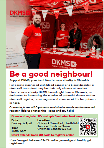 DKMS and becoming a blood stem cell donor Before Covid, over 30,000 people came to work in Chiswick every day. It’s much less now but numbers are creeping up on midweek days. Businesses in wards seldom contact councillors; they just get on with it, commuting in and out, enjoying our shops, bars, cafes, restaurants and service businesses during lunch breaks and before going home. I had no idea that DKMS, an important blood cancer charity, had been based here for 12 years and was profoundly moved by its work, described through real-life life-saving stories during a networking event at Chiswick Town Hall. DKMS operates in seven countries, providing blood stem cells to people with blood cancer or a blood disorder. It doesn’t run a blood bank, or a blood stem cell bank, it runs a donor register of people willing to donate blood stem cells if they are a match with a patient. Four out of 10 patients will not find a match. Only seven per cent of the eligible population in the UK are registered and, of them, only a tiny proportion are from minority ethnic communities. As potential donors need to be between 17 and 55 years old, my immediate thought was that, surely in this hugely diverse London borough, our academies and schools could help shift the figures. I have suggested that the council works, cross party, to introduce DKMS to students, parents, staff, support staff and wider school communities, to build its register. If you are the right age, would you like to help? Come to the town hall on Sunday, 6 April between 11am and 4pm to learn more and provide a cheek swab to find out if you are eligible to be a donor and join the register.