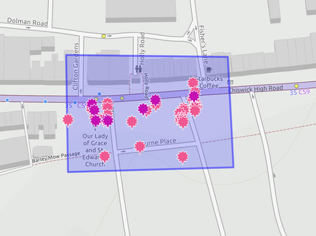 The Hounslow Cycling Campaign points out that this area has has the worst record for casualties involving cyclists, pedestrians and motor vehicles on Chiswick High Road. The complexity of traffic entering or exiting side roads with traffic along Chiswick High Road produces a large number of conflicts and collisions.