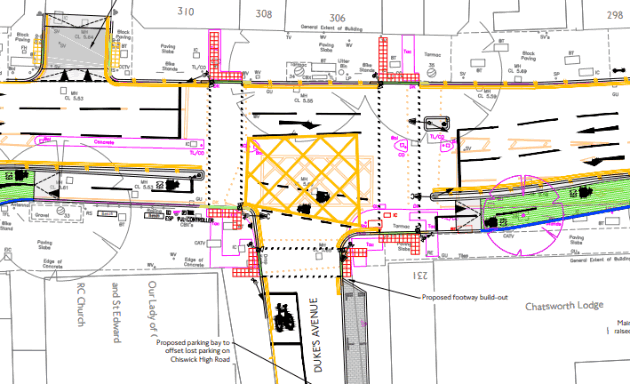 As part of the detailed design process, the designs will be subject to a full road safety audit by an independent auditor and any specific issues relating to, for example, blocks to visibility will be further considered at this point. Officers also address research cited by Redesign CS9 and other objectors which suggested that bi-directional cycle paths could increase the number of collisions. The report states, " officers would perhaps question whether evidence about risk factors derived from facilities largely located overseas are directly attributable to the west London context and the specific C9 proposals in Chiswick, with all the detailed mitigation they include. We have also noted alternative interpretations of the risk factors derived from academic journals that suggests the view that such a facility could lead to more collisions than the current arrangement (that includes little or no dedicated facilities for cyclists) may be incorrect." More detailed date on collisions in the local area is included in the report. This shows that one junction disproportionately contributes to these figures, Duke Road. Here, there have been a total of 12 personal injury collisions in the last 5 years, of which 4 have resulted in injury to cyclists one of which was classed as serious. This represents nearly a third of all collisions on the southern side of Chiswick High Road. On the issue of loss of pedestrian space the report points out that the northern side is almost entirely unchanged. On the southern side (which as noted above is substantially less busy), some footways would be cut back in certain locations where they are considered wide enough for safe, comfortable There have been a large number of concerns expressed about the loss of trees due to the scheme. The report says that just four mature trees will need to be removed on Chiswick High Road and there will be nine trees planted in their place. In addition they are recommending that TfL fund a tree-planting program in the three Chiswick wards. Officers say they have reviewed a significant amount of data relating to parking supply vs. demand and loading requirements as well as wider evidence on the impact similar, though not directly comparable schemes, have had on local economic activity elsewhere. They state, "Whilst it is clear that the scheme will lead to some reduction in parking availability, it would appear that the remaining parking stock should be able to accommodate existing demand. This would appear to be the case even at peak times." They are dismissive of the idea that the scheme will have a negative impact for local retailers or that the 'café culture' of Chiswick High Road will be affected. It was pointed out that the consultation also generated a large number of comments about the behaviour of some cyclists. This included jumping red lights and cycling illegally on footways. Officers consider that the provision of dedicated facilities such as that proposed as part of the scheme should help reduce illegal behaviour by providing formalised facilities for cyclists, reducing the need for them to use designated footways, and improving journey times generally, reducing the need for red light running and other such risk-taking behaviour. In response to a request for a cycle speed limit in the area the officers said that there was no legislation in place to make these restrictions legally enforceable. More detailed maps of the scheme are also included in the information to be presented to the cabinet including the new planned layout around the junction with Dukes Avenue which retains two lanes for traffic eastbound. It has been possible to achieve this by amending the layout on the westbound approach to the junction, resulting in the loss of one tree. Scepticism has been expressed that a safe design could be created given limitations of space due to the decision not to run the cycleway on the pavement in front of the Church. The map does not show road widths but elsewhere on the report officers state that they are comfortable with proposed lane widths of 3 metres. HGVs can be up to 2.55 metres wide and the new routemasters including those on the 267 route are a similar width. Officers say they are willing to accept designs under the normally accepted width for this type of highway because of the pending speed restriction of 20mph. The majority of the lane widths on Chiswick High Road will remain at 3.2 metres but for a 50 metre portion of the road there will be two opposing lanes of 3 metre.