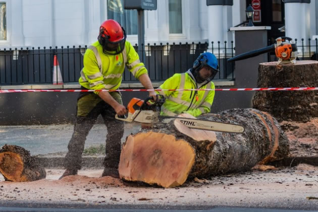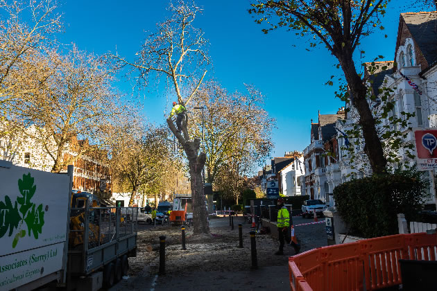 Contractors working on amendments to the Temporary Cycleway 9 scheme have removed a ninety-year-old tree from Chiswick High Road. Transport for London and Hounslow Council decided the London Plane tree needed to be cut down to provide room for both the bidirectional cycleway and a left filter lane for turning into Chiswick Lane. It had been determined that under the original design there had been increased delays as westbound traffic was getting stuck behind vehicles wishing to turn left. This resulted in queues which often stretched back to King Street and was causing delays to bus services which were also being impacted by the removal of bus lanes which are now being partly restored. The removal of the tree was part of the plan for the permanent cycleway proposed before the pandemic although originally three trees were slated for removal in this section. The council says that the loss of the tree will be compensated for by the planting of ten new trees in the area and possibly 'green rooves' for nearby bus stops. Although the traffic order enabling the works is experimental and therefore the changes are deemed temporary, it is understood this does allow the removal of mature trees is allowed. A London Plane tree can live for three hundred years and signs were posted on the tree pleading for a reprieve but these were removed by contractors before they cut it down.