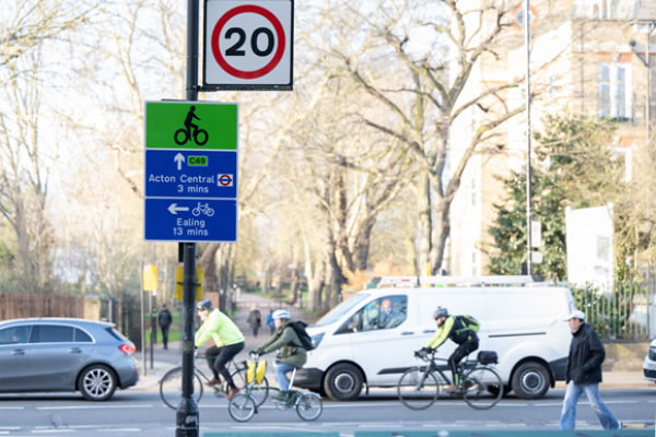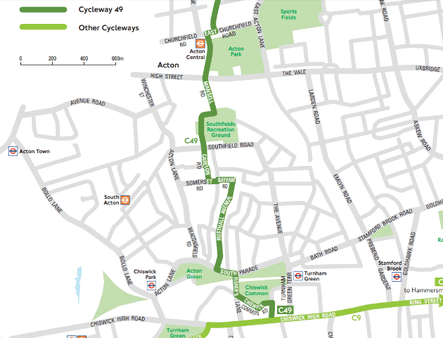 March 26, 2023 Transport for London (TfL) has announced the launch of a ‘new’ cycleway running through Chiswick even though it has been in operation for over a year. A press statement said that Cycleway 49 which links Chiswick to East Acton was one of three cycleways being added this week to a network of safe cycle routes across London. The 4 kilometre route is part of TfL’s aim to bring every Londoner within 400 metres of a ‘high-quality’ cycle route. Signs appeared along the route of Cycleway 49 last year and no additions or enhancements appear to have been made since last year. We asked TfL to clarify what exactly was being launched but they did not respond. The three ‘new’ routes announced on 24 March make use of low traffic local streets rather than the segregated pathways used on Cycleway 9 and, in the Chiswick area at least, appear to have involved little investment other than some new road signs. Collectively, the routes bring 124,000 Londoners within the target distance of a cycle route according to TfL. The Mayor’s long-term target is for 70% to be within 400 metre of a designated cycle route by 2041. In its statement TfL says, “The new routes will connect communities across London including Herne Hill, Brixton, Clapham, Angel, Barbican, Chiswick and Acton Central to the Cycleways network, unlocking access to cycling for local residents and helping to boost diversity in cycling.” However, some local cyclists have expressed concerns to us that this announcement could be being used to distract attention from a scaling back of investment plans for more expensive segregated cycling infrastructure particularly in the local area. They point out that another statement issued this week in which TfL confirmed the start of work on Cycleway 9 between Watermans Park and Kew Bridge talked about route being completed when work was finished in the next six months along with another planned extension along Hammersmith Road. No reference was made to plans drawn up in 2021 for an extension from Brentford to Hounslow and it is understood that funding has yet to be allocated to the scheme by TfL.
