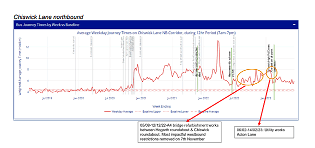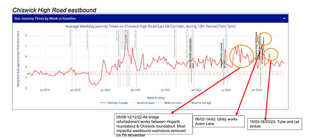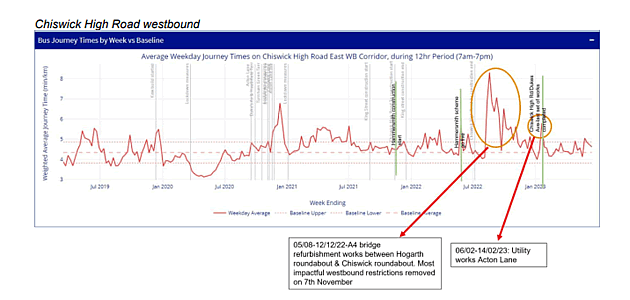 In Spring 2021, TfL installed automatic monitoring cameras at Heathfield Terrace and Chiswick High Road (west of Chiswick Lane) to count the number of cyclists using the new cycle lane. Before the cameras were installed, TfL counted the number of people cycling on Chiswick High Road manually once a year. In spring 2019, before the experimental changes to Chiswick High Road were built, manual counts showed that there were 2,114 people cycling here during the week. By spring 2022, this had risen to 2,592 an increase of 23 per cent. TfL has measured the total distance travelled by all cyclists in a particular area or ‘Cycle Kilometres’. It says this gives a more complete picture of cycle use and this shows a 47% increase between 2021 and 2023. 60% of respondents said that they felt less safe walking or cycling on the High Road than before with 32% saying they believed they were safer. In a later section of the survey in which respondents were allowed to give more detailed replies, the largest number expressed concern about pedestrian safety particularly at bus stop by-passes, followed by concerns about dangerous cycling such as speeding and ignoring traffic lights and then reservations about cyclist safety when vehicles emerge from side roads. Age Concern Chiswick commented that the new bus stop bypasses are dangerous for older people since ‘cyclists often do not stop for pedestrians’ and added that there can also be delays to buses and ambulances. Pocklington Lodge Tenants’ Association stated that visually impaired people find it more difficult to access bus services due to the bus stop by-passes as it is difficult for them to be sure it is safe to cross the cycle lanes to the bus stop. The Goldhawk Road/Chiswick High Road junction was given as a particular example. The Bedford Park Bicycle Club commented that the scheme had been an ‘excellent improvement’, highlighting that children are now able to safely cycle to school. Suggested that permanent signage be added to instruct motorists to look both ways at junctions which cross the cycle The monitoring report issued by TfL shows that the number of collisions involving cyclists as fallen since the safety upgrades were made to the cycleway on Chiswick High Road earlier this year, although it is acknowledged that it is too early to reach a firm conclusion on whether this is a permanent trend. Most serious collisions on the Cycleway have occurred on the King Street section particularly near Welte Road which is not covered by the report. TfL says, “Now that the improvements to the scheme have been fully completed, the collision rate has decreased significantly compared to the time before the experimental scheme was introduced and compared to the original experiment. We will of course need to collect more data, but we are encouraged by these initial indications.” The report continues, “We’ve looked at whether there have been any collisions between pedestrians and cyclists on Chiswick High Road since the scheme was originally introduced in December 2020. There has only been one collision recorded that involved a pedestrian and a cyclist and this happened while we were building improvements to the scheme, and when the cycle lane (and therefore the bus stop bypass) was closed. There have been no pedestrian collisions recorded since the full improvements were completed.” Only 10% of respondents felt that traffic was flowing more freely with 74% saying that congestion had increased and 61% saying it was more difficult to get to shops on the High Road. The monitoring report included data on bus times which showed that performance had deteriorated particularly eastbound on the High Road and northbound on Chiswick Lane. The average journey time during the weekday (7am – 7pm) had increased by less than a minute per kilometre eastbound and 1.7 minutes on Chiswick Lane northbound.
