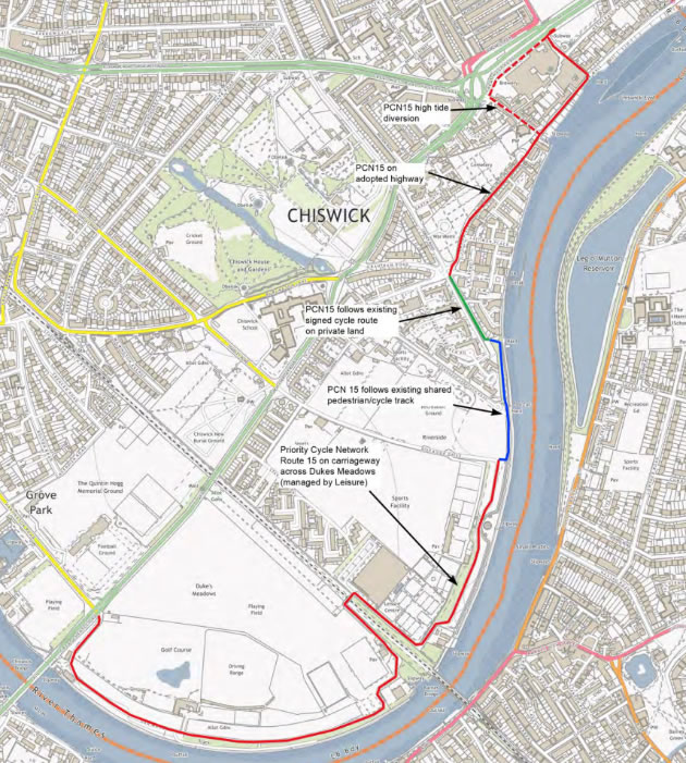 January 2, 2024 Hounslow Council is to proceed with the creation of a new cycle route along the Thames Path in Chiswick. Priority Cycle Network Route 15 (PCN15) will link Richmond and Chiswick allowing cyclists to avoid areas of heavy traffic. There will be no construction work involved in the scheme other than change to a traffic island on Chiswick Mall and the project cost is expected to be just £12,000 with most of the expenditure on new wayfinding signage. PCN15 begins at the entrance to Dan Mason Drive by the A316 and continues around under the railway bridge by the Riverside Health Club and then back towards the river via The Promenade. When it reaches the Thames Crescent estate it diverts away from the river onto private roads at the back of the estate and along Pumping Station Road until it rejoins the Thames Path by Chiswick Mall. There will be an alternative route at this section to be used when Chiswick Mall is flooded. It is hoped that installing signs providing route confirmation directing cyclist away from the No Cycling restrictions along the river frontage at Thames Crescent will reduce the number of cyclists using this section of the Thames Path. The existing traffic island at the junction of Chiswick Mall and Chiswick Lane South will be reduced in size to provide sufficient space for a new cycle contraflow lane at the current “No Entry” westbound restriction. The current cycle track designed to by-pass the restriction at Chiswick Mall is overgrown and muddy due to frequent tidal flooding and it will be reconstructed further away from the river wall. Alternative routes were considered including encouraging increased use of the pathway alongside the A316, but these were deemed not to fulfil the aim of allowing cyclists to avoid areas of high vehicular traffic. The council forwarded the proposals to the Old Chiswick Protection Society (OCPS) last year and a number of objections were received form OCPS members. Hounslow Cycling gave its support for the proposals and recommended further improvements, but officers concluded these were beyond the scope of the project.