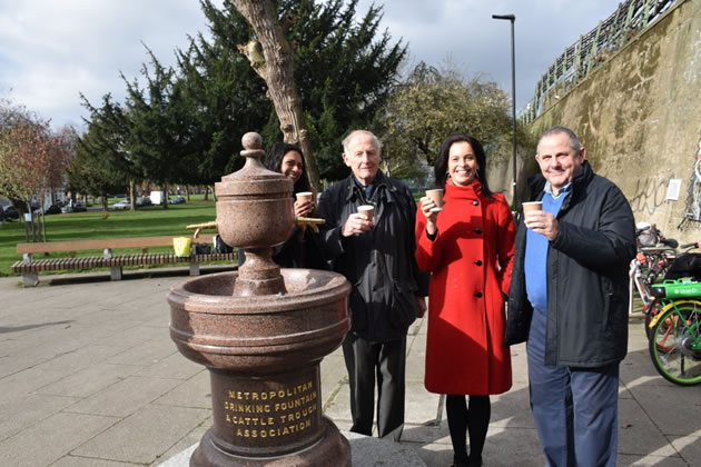 A ceremony was held this Thursday (12 March) to mark the completed restoration and relaunch of the previously disused drinking fountain on Turnham Green Terrace. The project, which cost £14,000, was spearheaded by local councillor John Todd, with funding help from Heritage of London Trust, Hounslow Council, and the Metropolitan Drinking Fountain Association. The fountain can now give clean drinking water for passers-by and local residents and their pets. And with the current emphasis on saving plastic bottles, people will be able to refill their reusable bottles from the tap and dogs will also be catered for with a dog bowl at the bottom. Cllr John Todd, pictured above with Nicola Stacey of HoLT and leader of Hounslow Council, Steve Curran) cut the ribbon and said; 'I'm thrilled that we have managed to bring the fountain back to life." He thanked all those who had helped bring the project to successful fruition, including staff at Hounslow Council, the Heritage of London Trust, the Metropolitan Drinking Fountain Association, and others. This great achievement had been down to teamwork, he added.