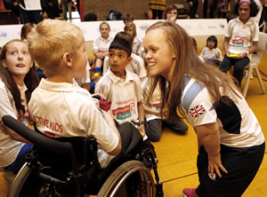 Sports display in Chiswick School After the Assembly, Ellie went on to watch a display by Chiswick school students in the sports hall. The session showcased some of the activities that will be replicated throughout schools under the Sainsbury’s Active Kids For All scheme. The programmes has been developed in partnership and will be delivered by Disability Sports organisations throughout the UK and Northern Ireland, alongside the Youth Sports Trust and is sponsored by the British Paralympic Association. Others attending the event included former Paralymian medallist Chris Holmes MBE, the London Director of Paralympics, and Barry Horne, Chief Executive of English Fedration of Disability Sport. Tim Hollingsworth , the Chief Executive of the British Paralympic Association was also present. The head teacher of Chiswick School, Mr. Anthony Ryan, said they were very honoured that the school was chosen to launch the event. September 14, 2012