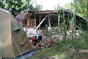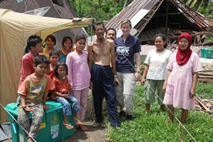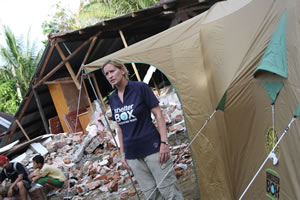 Chiswick aid worker Becky Maynard is currently in Indonesia to delivering aid following the earthquake in Padang, West Sumatra. Working, and volunteering, for ShelterBox– a disaster relief charity that specialises in providing emergency shelter, water purification and other essential survival items after disaster, Becky has sent ChiswickW4.com an update from the front line: Tuesday 6th October 2009 The UN is now reporting that search and rescue for survivors of the 7.6 magnitude earthquake that struck off the coast of West Sumatra on 30th September has been called off; villages completely covered by mudslides will remain as mass graves; while the focus will lie with getting aid to survivors of the disaster. ShelterBox has been in the area since Saturday carrying out assessments of the affected areas and starting to distribute urgently needed aid. The areas immediately around Padang do not look to be as devastated as the centre of the city, however as you reach the more remote areas where there is less money to invest in strong building infrastructure the destruction is enormous. A four-strong ShelterBox Response team has been in an area about 85 km north of Padang and in the majority of villages most if not all of the homes have been destroyed or damaged beyond safe habitation leaving tens of thousands homeless. Although fatalities in these areas were lower than in the city aid is very slow to reach them as access roads are in poor condition and bridges have been destroyed. ShelterBox provided enough aid for almost 500 people yesterday and enough for a further 6000 people is due to arrive in the forthcoming days. One of the key problems the displaced face is the weather. It is the start of the rainy season in Sumatra and when the rains come they are powerful and tarpaulins will have little chance of standing up to their onslaught. The team have been checking the condition of the tents that have gone up to ensure they have been correctly erected and will be capable of withstanding the conditions likely to hit them in the near future. Case Study In the Sungai Limau area tents have been distributed with the assistance of village chiefs to identify those in most need. Ali Munkar is struggling to protect the three families, including his own, who have turned to him for support. 12 people in all had nothing but a small wooden shed with just enough room for one bed to support them all. The risk they face when the weather comes in is enormous – either remain exposed to the elements or take shelter in a highly unstable building. Aftershocks are a big risk but rain and high winds could equally push the mostly destroyed building to collapse in its entirety. ShelterBox has provided a tent to the families allowing them, along with their existing wooden structure, to live in safety until they can begin the process of clearing the debris and rebuilding their homes and their lives.