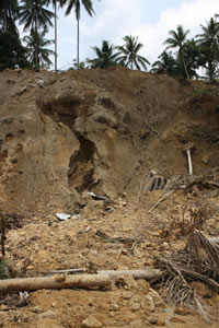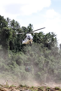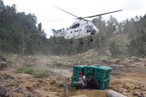 From the air the level of destruction was clearly visible and SRT members Andy Holland and Becky Maynard were able to fly with the Navy and identify the communities most in need. Becky reported, "Once the assessment had been completed and a suitable helicopter landing site had been identified near the village of Hulu Banda, Agam region, north of Padang, the US Navy provided a CH53 aircraft to deliver 45 boxes – enough aid for 450 people – to the drop zone.