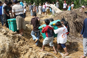 She added, "We’d like to say a big thank you to the members of HMN 265 Squadron as well as Rear Admiral Richard B. Landolt who assisted with the delivery. "Although we had seen huge amounts of destruction from the road, the site of the landslides, which had wiped out entire communities was tragic to see. Houses could be seen hanging from the edge of hillsides and more were smashed at the base of the landslide. "We only hope that by providing this shelter we can bring some small hope to the survivors of this tragedy. ShelterBox is becoming a house-hold name throughout the Navy worldwide and to work with the US Navy has been tremendous. Our immense gratitude goes to all of the US Navy team who helped us to achieve this." October 14, 2009 |