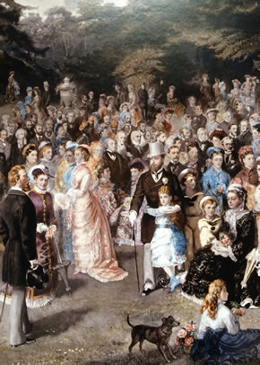 Queen Victoria wrote to her son in 1869: “There is a great fear lest you should have gay parties at Chiswick instead of going there to pass the Sunday, a day which is rightly considered one of rest, quietly for your repose with your dear children.” This detail from the portrait (see above) shows Queen Victoria sitting with some of her nine children and their husbands and wives, all members of the Royal houses of Europe. The future George V is leaning against her lap in a sailor suit, and the Prince of Wales is standing to her right in a top hat. To the left of the picture, holding a top hat, is the red-bearded Frederick, Imperial Crown Prince of Prussia, who would become the German emperor. He is with his wife, the Queen’s eldest daughter, known as Vicky. Just behind the Prince of Wales is the Rt Hon William Gladstone, and elsewhere in the picture are dozens of dukes, duchesses, earls and princesses. An accompanying key, which will also be displayed, identifies over 200 of the guests.