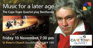 Over the last three years South African-born violinist, David Juritz, has been exploring the quartets with three distinguished colleagues in the Cape Town Quartet, Suzanne Martens, Karin Gaertner and Peter Martens. Working with guidance from the renowned Beethoven scholar, Dr Stewart Young, they are now at the mid-point of a cycle of the complete quartets and are playing three of them in London for the first time. 'Music for a Later Age' will be performed on Friday, 10 November at Venue: St Peters Church, Southfield Road W4 1BB at 7.30pm with doors open at 6.45pm. Tickets are £15.00 on the door or , £13.50 if you book in advance. (advanced booking ) All seating unreserved. Wine and soft drinks will be available. The quartet Op.18 No. 1 in F major (in fact the second quartet Beethoven completed) with its slow movement inspired by the tomb scene from Romeo and Juliet, is paired with the last major work Beethoven completed, the quartet Op.135 (also in F major). They are followed by the third of a set of quartets Beethoven wrote for an ill-starred Russian diplomat, Count Razumovsky, the Quartet No 9 in C major, Op. 59 No. 3. Beethoven wrote above a sketch for one of his Razumovsky Quartets, ‘Let your deafness no longer be a secret – not even in art’. With echoes of Mozart’s great Dissonance Quartet, Beethoven’s third Razumovsky with its extreme technical and musical demands proved too difficult for most musicians of his day. And yet, even if it stretched his contemporary audiences, it is music that communicates so directly as to be timeless. Music for this age or any other. Quartet No. 1 in F major, Op. 18, No. 1 Beethoven’s 16 string quartets are one of the great challenges for string players. David Juritz explains his fascination with this music. To me, Beethoven is unique. One the one hand there’s that incredibly intense celebration of humanity in the Ninth Symphony and then moments where he is absolutely uncompromising and single-minded. It’s so extreme that when I play it, it sometimes feels a little like exploring an alien mind. Even where he gives us clues, Beethoven’s music remains beyond simple interpretation. For instance, the final movement of his last quartet, Op. 135, is prefaced by an inscription, “Der schwer gefasste Entschluss”, or “The Difficult Resolution.” Two musical phrases are presented, one with the question “Muss es sein” (must it be?) and the other with the reply, “Es muss sein!” (it must be!). Is this an existential conflict, an expression of a deep internal struggle that Beethoven, writing what he knew would be his final quartet, felt compelled to confront? Perhaps, but another a clue lies in the note Beethoven sent to his publishers as he submitted the quartet to them. He had struggled to begin the final movement until, spurred on by constant reminders that it was overdue, he decided just to get on with it. Other interpretations are that words related to an argument with his housekeeper over her wages, or that it was inspired by a dispute with a patron over an unpaid subscription. The music that follows the introduction is totally free of angst, perhaps a hint that Beethoven had in mind something less troubling than any great philosophical crisis. Yet, despite the carefree exuberance and almost comical high-jinks, even if this is music about unpaid laundry bills, it’s anything but banal. That’s the miracle of Beethoven. The members of the Cape Town Quartet gave their first performance together in 2013 in series of concerts in the Western Cape and, in 2014 embarked on a project to perform the complete string quartets by Beethoven. David Juritz (first violin) was born in Cape Town but is now based in London. He performs internationally as a soloist and chamber music player. Suzanne Martens (second violin) studied in Holland and at the Mozarteum in Salzburg. She is a former leader of the Cape Philharmonic Orchestra and currently serves on the faculty of Stellenbosch Conservatoire. Karin Gaertner was principal violist of the Cape Town Symphony Orchestra. She studied in Italy and at the Salzburg Mozarteum before spending five years working in Italy. Peter Martens, another Mozarteum educated musician, performs regularly at festivals in Europe, Russia and the USA. His recording of the complete Beethoven sonatas for cello and piano is widely regarded as a definitive interpretation. The Cape Town Quartet have been fortunate to have the advice of the eminent Beethoven scholar, Dr. Stewart Young, while preparing their performances.