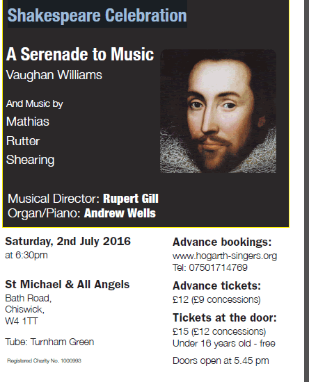 Hogarth Singers Summer Concert, Saturday 2 July at 6.30pm at St Michael and All Angels, Bath Road, Chiswick. Hogarth Singers will be contributing to the 400th centenary celebrations of the life of William Shakespeare by performing a selection of songs inspired by Shakespeare’s plays, set to music by Ralph Vaughan Williams, William Matthias, George Shearing, and John Rutter. The choir, directed by Music Director Rupert Gill and accompanied by Andrew Wells, will be joined by the choir of Southfield School, and noted early music specialist Catherine Groom will play music of the period and actor Will Birch will read well known sonnets and extracts. The concert will be held at Hogarth Singers usual performance venue, St Michael and All Angels, Bath Road, Chiswick, W4 1TT, at 6.30pm - an earlier time than usual. Tickets are available from the choir’s website: www.hogarth-singers.org or on the door. Ticket price £12 (£9 concessions) in advance, or £15 (£12 concessions) on the door. Under 16s are free.