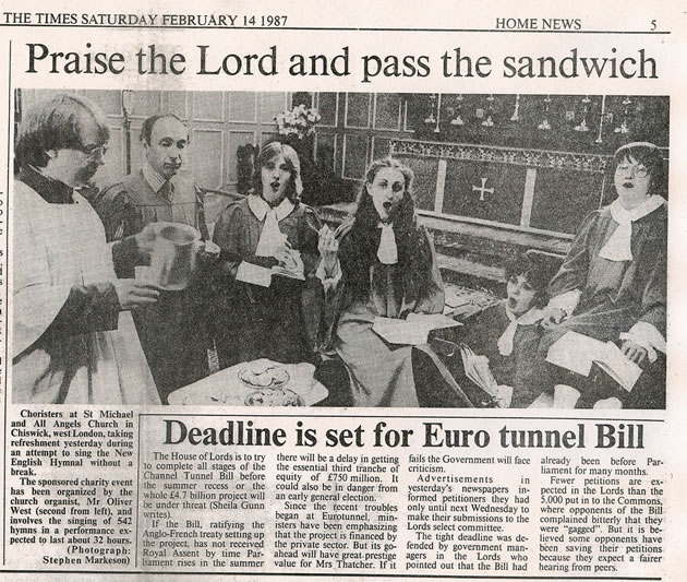 Choirs and singers from all over Chiswick will be converging on St Michael & All Angels Church next month to join in a 30-hour Hymnathon to raise money for its Organ Appeal and three charities. People can contribute on JustGiving at Hymnathon 2017. For the third time in 30 years, people at St Michael’s will be singing all 542 hymns in the New English Hymnal, going right through the night. They say everyone is welcome to drop in for as long – or as little – as they like, and some members of the congregation are hoping to be there for almost the whole 30 hours! The Hymnathon starts at 12 noon on Friday 3 March and will end sometime after 6pm on Saturday 4 March. “We last did it five years ago to raise money for our new organ and as well as being great fun, and bringing the community together, it was a wonderfully spiritual occasion” says Father Kevin Morris, the vicar of St Michael & All Angels. “People dropped in thinking they would sing just a couple of hymns and couldn’t drag themselves away!” The singing will be led for much of the time by the Choir and Choristers at St Michael & All Angels, as well as various of its church groups, such as its sidespeople, readers, gardeners and Men’s Society. St Michaels’ director of music Jonathan Dods will lead the team of organists who will take turns to play throughout the 30 hours. Lots of local choirs and churches are taking part including singers from Chiswick Choir, the Hogarth Singers, St Peter's Southfield Road, Our Lady of Grace, St Michael's Elmwood Road and St Saviour Wendell Park. There will also be children from local schools and singers from St Michaels’ three charities for 2017 - The Upper Room, Msaada and The Amber Trust – who will receive 20 per cent of the total raised. Children are being encouraged to sing during ‘The Christmas Hour’ between 1pm and 2pm on Friday March 4th, when the hymns will include Away in a Manger, O Come All Ye Faithful, Silent Night, O Little Town of Bethlehem and other popular carols. Everyone else is welcome then too. You can see when each hymn is due to be sung in the Hour by Hour guide on the church website. To sustain the singers, there will be food and drink provided by local businesses and the church’s own cake-bakers. There will also be a Midnight Feast on the Friday and Breakfast and Afternoon Tea on the Saturday (to coincide with the singing of Jerusalem and the National Anthem). Local firms that would like to support the event should contact Torin Douglas at torindouglas@gmail.com. Choirs that would like to join in and book a specific time-slot should contact the Hymnathon organizer Oliver West by email at oliver@oliverandliswest.co.uk . Or singers can simply turn up with friends for as long as they like. Oliver West organized the very first Hymnathon at St Michael’s in 1987, when he was the church organist. Pictures of the event made the front page of the Independent, and the inside of The Times.