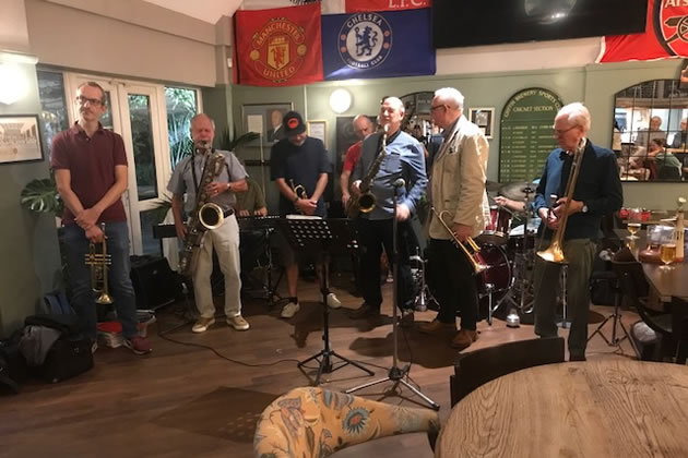 At the August session, Chris Hodgkins got on a ‘Slow Boat to China’. Lester and Anthony on trumpets and Mark and Dave on tenor and baritone saxes blew their respective duets. All the Band featured on Neal Hefti’s ‘Splanky’, made famous by the Count Basie Orchestra. Following a rocking version of Duke Ellington’s ‘It Don’t Mean a Thing’ showcasing the magnificent drumming of Dave Clancy, the Band finished with ‘Indiana’.
