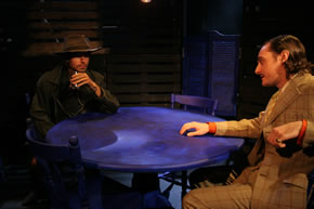 The town is under threat from an approaching band of brigands even more greedy and ruthless than Clay and he’s scared. But before the attack there’s plenty of time for some hilarious moral, political and economic arguments with points on both sides. Clay might own the water, after it has fallen from the sky, but Dogstar claims to own the land because he won a big pebble in a poker game. And when Violet (Laura Predelska), the only virgin in town turns up there’s plenty of innuendo thrown into the mix as they discuss the value of a woman’s honour. Violet is guarding her status with a chastity belt but it soon becomes clear that it’s available to the highest bidder, like everything else in this town. The fourth member of the crew is Jed (James Sygrove) the hapless, twitchy barman who acts almost as a Greek Chorus as he tells Dogstar the truth about the town and his horrible boss and the strange practise of removing the nipples of baby boys at birth. The dialogue is sharply observed, peppered with clever one-liners and sly references to modern capitalist bullies. In this town you even have to pay to go to the loo!
