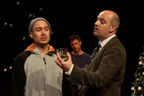 Image: Richard Evans A first from writer Greg A. Smith, it’s very well-meaning as he wanted to explore the plight of the homeless at Christmas, and the writing’s at its best when that’s the topic in the frame. It’s aided by a very strong performance from Michael Longhi as Rory the homeless man, playing him with a nice mix of intelligence and befuddlement. He’s also the only one of the seven characters who is remotely likeable. Rory has been invited to spend Christmas Day with Chiswick couple Tamsin (Nikki Squire) and Harry (Michael Duran) and their appalling daughter Jenna (Phoebe Batteson-Brown). But all is not as it seems, they’ve got an ulterior motive as is revealed when their friends Donald (Simon Mitelman) and Marissa (Sarah Hannah) arrive with Den (Jim Mannering), the homeless man they’ve taken in for Christmas.