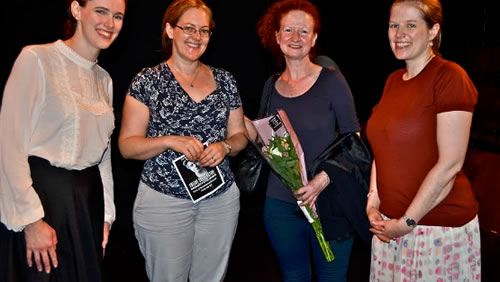 Members of the Sheehy Skeffington family attended pictured with actor Ailis Duff(left) and writer Ros Scanlon (holding the flowers) Ailis Duff brings energy and passion to the role, and is definitely a talent to watch. The role is quite physically demanding as she moves constantly over the small stage bringing the character to life, at times bursting defiantly into song, running from soup kitchen to prison. A large screen at the rear of the stage displays archive film material and the production also uses recorded voice overs from actor Tony Rohr and James Reilly to bring the male authoritarian voice of the judges and politicians into play. Sadly at the end of her life (she died in 1946), Hanna felt that the Irish State had failed the revolutionary women of Ireland. She had no pension and was forced to rely on the small income generated by part-time teaching . In 1945 , she fell ill and unable to support herself, she died on Easter Saturday, exactly thirty years following the death of her husband. If the story of Hanna Sheehy Skeffington has been mainly left untold in contemporary Ireland, then Ros Scanlon and Ailis Duff have not only restored her memory but given it a compelling artistic expression which deserves a wider audiance. The play is a production of the Irish Repertory Theatre Co, supported by the Irish Cultural Centre. Anne Flaherty