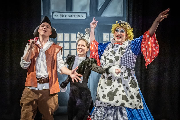 January 21, 2024 “Look Behind You ”, by Daniel Wain is a celebration of the 25th anniversary production that was first shown at the Theatre at the Tabard in 1999 - when it received many rave reviews. The plot concerns a troupe of actors who are presenting Dick Whittington, “in a godforsaken seaside town, somewhere far, far away from the paved gold of old London Town…” I had expected a possibly bawdy take-off of an out of town pantomime I was taken back by the invective of the politics aired by the characters when off stage; as well as the strife between this fictional cast. Dan Wain’s gloriously charismatic, energetic, yet deeply poignant drag performance holds the show together. His numerous costumes, designed by Lesley Alexander and Juanita Al-Dahhan, bubble with fun and are a contrast to his bitter polemic about lack of funding to the British theatre and other significant issues. A cast as large as eleven actors is unusual at the Tabard but they appear to have been well bonded into a strong team by the director, Barney Hart Dyke. Several actors need to work on projecting their voices more decisively so that they can be heard at the back of this cosy auditorium. However, this does not apply to Cait Hart Dyke’s voice as she delivers her lines with aplomb. Olivia Jackson is endearing as Dick’s cat and her body language as a mute animal is spot on! A most convincing cherubic pussy cat. The ingenious set, designed by Richard Evans and Robert Hellstrand , is innovative and exceptionally flexible. A bright white, ruched shiny satin curtain with red velvet sides was a surprise as we entered the theatre. But there are other surprises connected with the appealing set.
