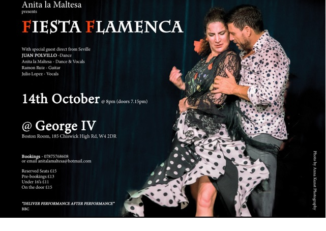 Anita La Maltesa (dance and vocals) and Ramon Ruiz (flamenco guitar) proudly present a spectacle of flamenco passion together with special guest musicians and dancers direct from Spain. 185 Chiswick High Road, W4 2DR 8.00pm (doors 7.15), Tickets £13 (on door £15) 07875 768608, anitalamaltesa@hotmail.co.uk September 26, 2018 |