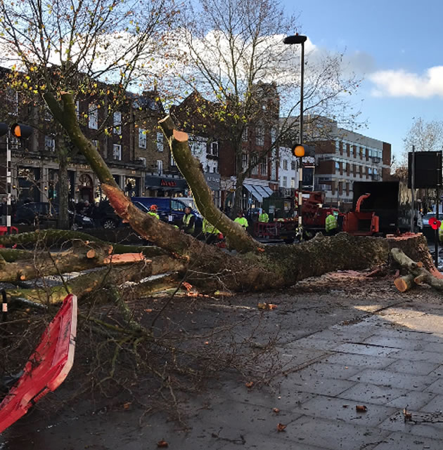 On Friday, the large oak tree was felled to allow Thames Water engineers to access the burst water main, which serves several hundred homes, but the delay in taking action caused local anger. A section of the High Road was closed off on Friday morning to allow the tree to be felled, and diversions were put in place around Chiswick, which caused lengthy traffic and bus delays. Leader of Hounslow Council Steve Curran and local councillor John Todd were at the scene and commented, "It's a shame to see such a marvelous tree being felled. Thames Water have promised to replace the tree. This emergency work had to be carried out because of a major burst water that feeds thousands of homes." The nearby stalls selling fruit, vegetables and flowers, were still able to operate during the works - pedestrian access was allowed once the tree was felled, but the stallholder said he had lost a lot of business during the week. A spokesperson for Thames Water told Chiswickw4.com that it was a complicated job due to the location of the pipe and the number of homes it supplies - so it had to be done at night time on Friday.