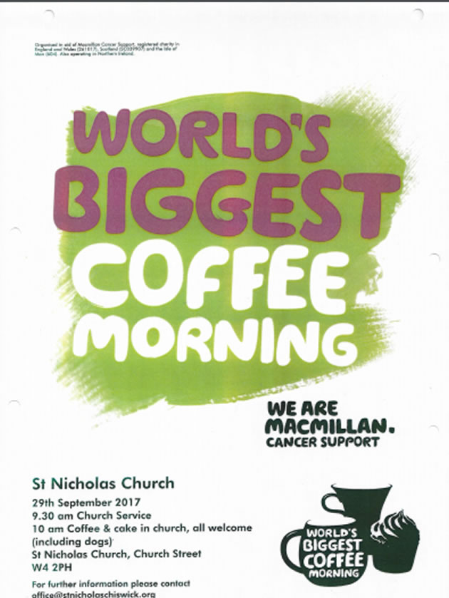 It's almost time for the annual Macmillan Coffee Morning in aid of the charity which supports people with cancer and there will be a number of local fund-raising events locally. At St Nicholas church, on Friday 29 September, local people are invited to attend their coffee morning at 10 a.m. Dogs are also welcome. The coffee morning will be preceded by a church service at 9.30 am The World’s Biggest Coffee Morning is Macmillan’s biggest fundraising event for people facing cancer. The charity asks people all over the UK to host their own Coffee Mornings and donations on the day are made to Macmillan. Last year alone they raised £29.5 million.