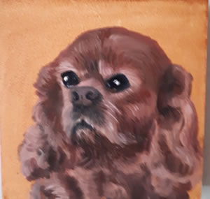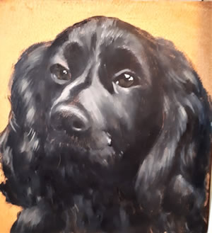 Example of sgraffito technique on Triptych Mariana now lives and works in Shepherd's Bush. She is now free to travel to Romania as often as she wishes and plans to set up an 'artists colony' near a spa town which will contain many of her works, and which will be her legacy. She also paints landscapes, using the sgraffito technique in order to express a wide range of emotions, "from the innocent wonder and joy of the moment to the deep sorrow brought by its ephemerality. The sgraffito technique consists of many layers of paint which I then scratch, (literally, using both ends of my brush!) to create a landscape gently defined by spontaneous and energetic lines. Just like my thoughts…barely scratching the surface!" Mariana will be holding an exhibition of her figurative sculpture and a new collection of her sgraffito oil paintings from Sunday 5 May 11-6 pm. at Acava Studios, 62, Hetley Road W12. She would be happy to accept commissions to paint portraits of people or animals. Here are two paintings of very cute Chiswick dogs which Mariana painted recently.