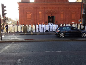 There was a large attendance of clergy and the local congregation, family and friends at the Ordination to the Diaconate of Derek Hyett at Our Lady of Grace and St Edwards church recently. There were around 30 clergy – priests and deacons – at Derek’s ordination which was presided over by the Most Rev. Bishop John Sherrington, Auxiliary Bishop of Westminster. Derek has been involved in the local parish, particularly with music, for a number of years. Derek is originally from Liverpool and was formerly an Anglican cleric. He has been living in the parish of Our Lady of Grace & St Edward on and off for the last 5 years whilst working at St Thomas More Language College in Chelsea as chaplain and as a base whilst studying at seminary. He will serve as a deacon at the parish of the Immaculate Heart of Mary and St Dominic in Homerton while preparing for ordination to the priesthood in the not too distant future.