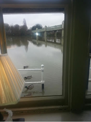The current river flow is expected to remain high for the next five days or so and Flood Alerts have been issued for several areas across London, including Chiswick. The unusually high river levels and strong currents are due to the levels of rain- with January predicted to be the wettest month in the past 100 years. Local residents have been taking pictures of the riverside scenes, including this one below taken at The Bull's Head where the ducks are almost at a level with the window ledge.