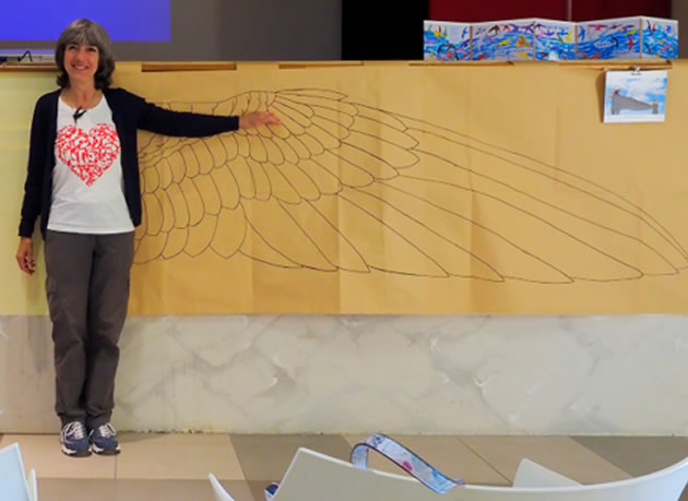 Catherine at the exhibition at Campiglia with a giant swift wing drawn to scale to illustrate how big a swift’s wing would be at human scale. Just behind it on the stage is the mini-version of the Chiswick Swift Project ‘River of Swifts’ artwork from last year's Tidefest. Today is World Swift Day - 7th June!. Celebrate it by looking up to see if you can spot any of these charismatic summer birds. The first of our W4 swifts arrived exactly a month ago today overnight on 6th-7th May. These amazing migratory birds have brought Chiswick and a small hill town in Tuscany together in a joint collaboration to conserve this threatened species. To mark World Swift Day, Catherine Day, local RSPB Swift Volunteer who leads the Chiswick Swift Project explains how the connection came about: “Jon Perry and I have just arrived back from a trip to Italy to visit a swift project in Campiglia Marittima, a small town about 90km south of Pisa. It is a really appropriate coincidence that today happens to be world swift day. The photo shows a mini-version of the Chiswick Swift Project ‘River of Swifts’ collage on display in Campiglia that we took to show in an exhibition of photographs of swifts, swallows and house martins that is being held at the moment during the town’s ‘Festival dei Rondoni’ (Festival of Swifts). The exhibition displays work by international ‘iskiography’ photographer Lothar Schiffler and entries by local photographers, and there was also a contribution of photos of Chiswick Swifts by Jon. Lots of readers will remember seeing the ‘River of Swifts’ collage at our stand at Tidefest at Strand on the Green last September and afterwards when it was on show at Chiswick Library. Even though we could only take a mini version, it was much admired in Campiglia. Well done to all the children (and parents!) in Chiswick who came to make a colourful swift for the original artwork!