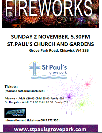 The popular Fireworks Display will take place on Sunday 2nd November, 5.30PM at St Paul's Church and Gardens, Grove Park Road, Chiswick W4 3SB.