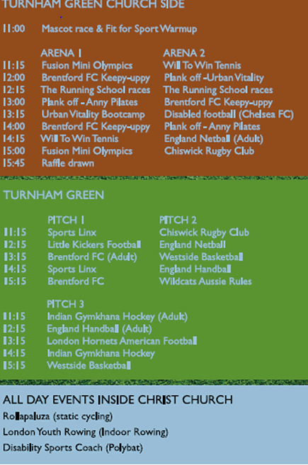 The schedule for the Get Active Hounslow Super Saturday of Sport in Chiswick has been unveiled by the event organisers. 40 sports and activities will be free to try for all ages and abilities ( from two to 102) across four sites in the centre of Chiswick on July 19th at Turnham Green from 11-4. Last summer's Super Saturday of Sport organised by Kirsten and Andrew Lonsdale, was a great success. The idea of the open sports day is to allow people to try out a variety of sports which might then encourage them to go on and enrol. The programme below gives some idea of the variety of events planned and there are others going on indoors at Christ Church. All are welcome.
