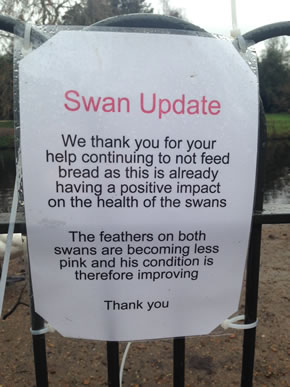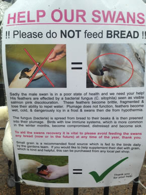 The bacterial fungus is spread from bread to their beaks and then preened into their plumage. It causes a pink discoloration on the wings which then become brittle and lose their ability to repel water. This can cause the wings to become wet and dangerously icy in frosty weather and the birds can potentially die from hypothermia. If people wish to help in feeding swans, staff have advised them to purchase the appropriate type of grain from a pet shop.