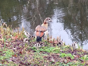 Dog walkers at Chiswick House Gardens have been taking an interest in the early Spring activites of the birdlife there. This image of the Egyptian Geese goslings was sent in by a reader. Pic- Lindsay van der Merwe Staff have been urging people not to feed bread to the swans. One male swan has suffered a debilitating virus as a result of eating bread fed by members of the public. Happily now that people have obeyed the instruction not to feed the swans, the bird in question has improved. Staff had put up posters alerting people to the dangers posed to the wildlife by unthinking members of the public feeding them.