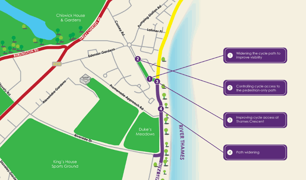 Hounslow Council says that because of the high number of users they want to hear local views on whether it would benefit from any changes or if the current layout works well Whilst there are no cycling signs at the entrance to the pedestrian-only footpath, signage for the permitted cycle route is poor and the quality of the permitted cycle route deemed to be low. The path that connects to the two roads is of substandard width for a shared-use path and both routes require cyclists to dismount. These factors are believed to contribute to poor compliance with the no cycling restrictions. "Better signage and improvements to the cycle routes, in conjunction with more effective barriers to the pedestrian only path, could improve compliance and the experience for both pedestrians and cyclists. It may also improve the experience for all if the effective width of the shared-use path is made greater," says Hounslow Council.