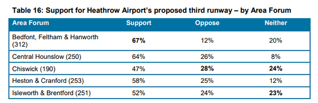 An independent survey commissioned by Hounslow Council has shown that a significant majority of people in the borough are in favour of the expansion of Heathrow Airport. Perhaps most surprisingly a breakdown of the responses by postcode showed that only 28% of Chiswick residents were against a Third Runway. The poll was taken as part of the Council’s bi-annual survey which was carried out last autumn by independent research agency BMG Research who interviewed 1,256 residents on their doorsteps. Overall, more than 60% of respondents were in favour of the Third Runway with around 25% against. The support for a third runway varied by area forum with residents in Bedfont, Feltham & Hanworth being more likely to support the proposal (67%) and those in Chiswick and Isleworth & Brentford the least likely to back it (47% and 52% respectively). However, because London Borough of Hounslow residents only were surveyed, those living in the North of Chiswick in the London Borough of Ealing. who are likely to be worst affected by the new runway, were not consulted. The Third Runway will be to the north of the existing ones and the flightpath is likely to be over the Acton Green and Bedford Park areas. A spokesperson for CHATR, the Chiswick based campaign group opposed to the Third Runway said, 'CHATR has found no evidence of widespread support for Heathrow expansion - the reverse, there is great distress and concern at the devastating implications for an area as peaceful as Chiswick. It is unclear how these figures were compiled and how representative they are.' Ruth Cadbury MP for Brentford & Isleworth, who has consistently campaigned against a Third Runway said, “I am surprised the relative support for expansion was as high as this, but I wonder whether the result would be the same if the question was asked again after informing respondents of the noise impact of the new runway on their lives. Most people who live anywhere near the approach path for the runway are unaware of its route as neither the Government nor Heathrow have informed them, despite the route being easy enough to identify. And those near the existing approach paths are completely unaware that their current 8 hour respite will be cut when the third runway is built. “I also fear that people assume that because the Third Runway was agreed in Parliament last June, that it’s a done deal. In fact it’s very far from that. There are a number of large hurdles Heathrow has to go through; the ongoing legal challenge, the lack of funding for the much-needed additional rail access, the trend away from hub airport models towards point-to=point business, and so on.” She urged people to respond to Heathrow’s ongoing consultationand focus on the elements that affect the areas close to Heathrow such as the new late arrival path which will come in over north Chiswick even without the third Runway, the early morning alternation option, and the questions on Westerly Preference. Ruth Cadbury will be speaking (Commons business allowing) at a Public Meeting organised by BASHE (Brentford & Hounslow Stop Heathrow Expansion) which takes place at Nishkam School, Syon Lane, Osterley TW7 next Thursday, 28 February at 7pm. John Stewart from HACAN, Tim Crosland from Plan B Climate Change, and Geraldine Nicholson from the Heathrow Villages campaign will also be attending. The current consultation covers a number of topics: Runway Alternation; Airspace changes; Westerly Preference; Night Flights; Extra flights in advance of a third runway. All the proposals assume a third runway will be built. The consultation runs from 8 January to 4 March.