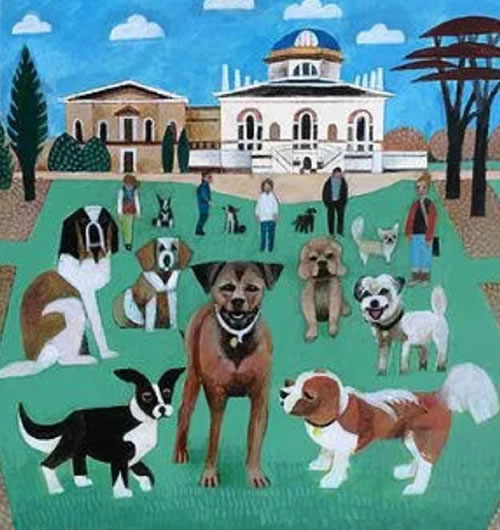 In 2014 Danny (the late Alfred Daniels) was asked to design a poster for the Chiswick House Dog Show. He enthusiastically agreed but had never used dogs as subjects before, and needed some photos. Jan Preece, Chair of the Show committee, volunteered to take some for him. This proved quite a challenge but from the selection Danny put together this painting, which was used for the poster and programme. The painting was subsequently auctioned, raising money towards the running of this popular Chiswick community event.