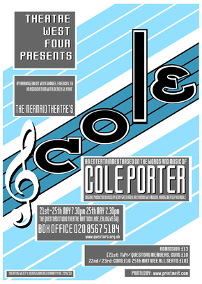 Devised by the creators of Cowardy Custard, Alan Strachan and Benny Green, COLE is a musical journey through the life of ‘the King of Musicals’ Cole Porter, one of the most prolific songwriters of the 20 th Century. Bursting with hit tunes such as Anything Goes, Night and Day and I Get a Kick Out of You and linked together with the story of his life from Yale to Paris to Manhattan, Broadway and Hollywood. You won't be able to stop tapping your feet and humming along. For almost fifty years Theatre West Four has been staging amateur productions in West London. Members come from all over London to participate in readings, workshops, rehearsals and productions. The group welcomes enthusiasts interested in performing, directing, producing, stage management and all aspects of theatre production. Many of its members and supporters live in Chiswick. COLE runs from Tuesday 21st to Saturday 25th May, including a Saturday matinee Questors Theatre, 12 Mattock Lane, W5 5BQ For tickets go to the website http://www.questors.org.uk/event.aspx?id=380 Or telephone the box office: 020 8567 5184 To join Theatre West Four go to their website at http://www.theatrewestfour.co.uk