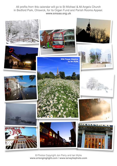 Station Lights- Jon Perry The 12 photos inside are: (January) A snowy Gunnersbury Triangle; (February) ‘Little Lamb’ and Sam’s; (March) All Angels Dawn; (April) Bedford Park blossom; (May) Turnham Green Station Lights; (June) A Chiswick House Dream Window once occupied by The Beatles; (July) Swan Lake by The Bell & Crown; (August) Now Showing at The Old Cinema; (September) The first 27 bus returns home to Chiswick Business Park, once the site of London Transport’s huge Bus Works; (October) Misty Chiswick House Morning; (November) Strand-on-the-Green freezing fog; (December) W4 White...in the snow.