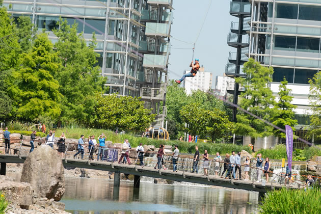 A total of 312 employees working at Chiswick Park, took part in the zip wire activity organised by Chiswick Park Enjoy-Work, the on-site estate management company. The zip line began 50 metres above the ground – the height of 11 double-decker buses – and ran from from level 9 of Building 7 for 300 metres, reaching up to 70 miles an hour, down to the entrance of the Park. The zip line marked its fourth consecutive year at Chiswick Park and is one of the most anticipated events on the Park. The activity was available to the 9,000 guests working on-site, from companies such as Danone, Discovery, Foxtons, Paramount Pictures and Starbucks. 587 people registered for the event via Chiswick Park’s community app, District Tech. A ballot was then organised for the selection. Chiswick Park Enjoy-Work organises over 40 events every year for its guests working on the park, as part of its programme of activities and services aiming to improve wellbeing in the workplace. ‘There is no limit to making our guests enjoy themselves. We do our best to create memorable experiences at Chiswick Park and the zip line is definitely one of them.’ said Matt Coulson, CEO Chiswick Park Enjoy-Work. Everything at Chiswick Park is designed to improve the life of all employees on-site. Set in 33 acres of landscape garden featuring a lake and waterfall, it also houses over 45,000 sq ft of retail space including an on-site Virgin Active gym, restaurants, convenience stores and a variety of pop-up traders and street-food vendors. The Enjoy-Work team