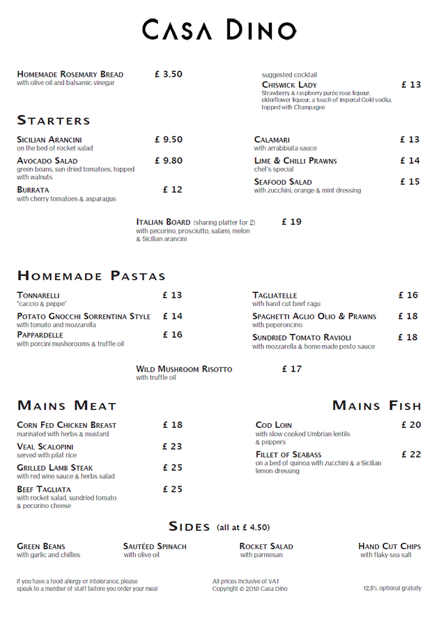 Moving into our 9th month in this wonderful and welcoming community, Casa Dino feels honoured to be in Chiswick. Over this short period of time we have built up relationships with a large and lovely group of local regular customers, some of which visit us several times a week. Our Sicilian Chef as does our front of house family staff take huge pride in the food that we serve here. With homemade rosemary bread made every evening, served warm with Tuscan Olive oil and white truffle vinegar to fresh pasta made on the premises, to the traditional tiramisu, here at Casa Dino we put food quality first. Casa Dino will be doing a new Bottomless Brunch on Sundays for the whole of July. Come along and enjoy a 2 course meal and bottomless Prosecco for 2 hours for £28.50.