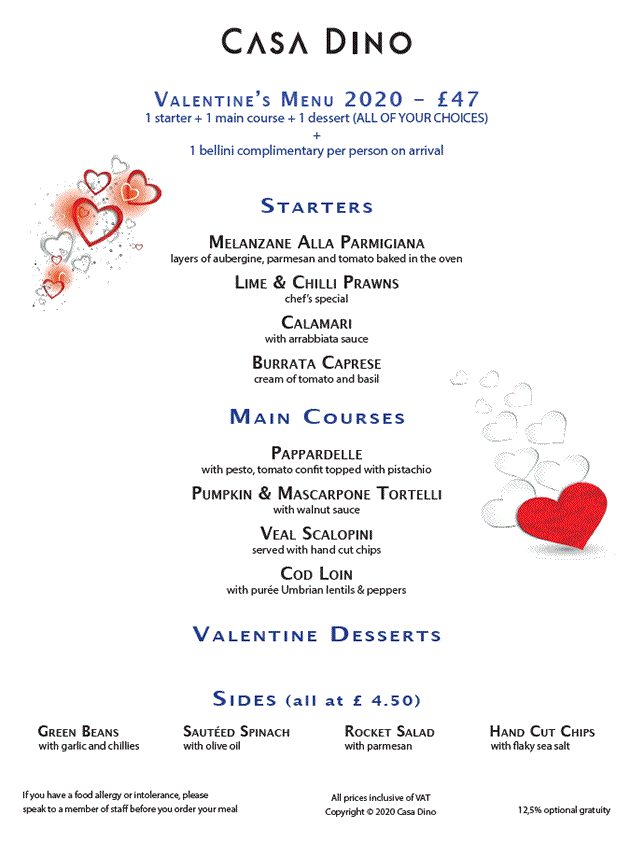 A DINING EXPERIENCEWe have worked hard to create an amazing all round experience for our customers that delivers on full bodied authentic Italian flavours, while making no sacrifices on our great service and warming atmosphere. Come to Casa Dino this Valentine's day and enjoy a special 3 course menu with a complimentary Bellini to start.