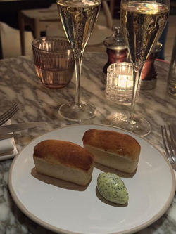 The restaurant was full the evening we visited with a real mix of young and old and couples and larger groups. We were having the wine pairing so were quickly supplied with wonderfully chilled glasses of Spanish Albarino white wine. Then 2 cute little miniature loaves of freshly baked bread arrived with a pat of butter with Chiswick House garden herbs. You can't go wrong with hot bread and these were just heavenly.