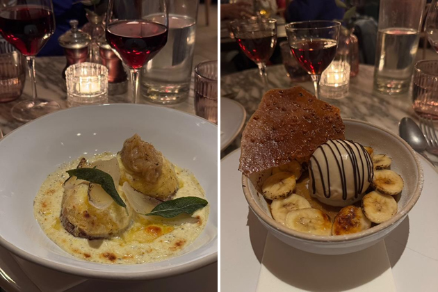 Normally, we wave away the dessert menu in restaurants due to being 'elegantly replete' after our main courses. But - alleluia! - thanks to the careful thought put into the balance of the starter and main course, we could dive in with enthusiasm. So a Muscovado Custard, Caramelised Banana & Hazelnut ice cream paired with Rutherglen Muscat from Australia times two it was. Again, this is something I probably wouldn't have chosen and more fool me - the custard was a bit like a particularly tasty creme brulee and the ice cream on top a chilly treat.